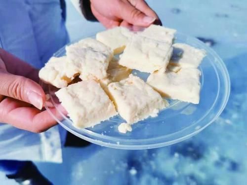 因为冰面上风很大,酸奶成型也比较快,四周用铲子铲一下,就可以看见已经凝结的小酸奶片。