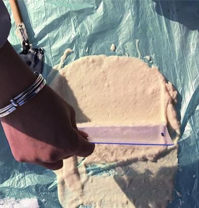 环顾四周,记者特意挑选了一个靠近桥下市民较少的位置。首先,将干净的塑料袋铺到冰面上,但是塑料比较轻,风一吹,容易移动,记者又将塑料四周用酸奶和雪块压上,方寸之间,就变成了一个小小的“操作台”。
